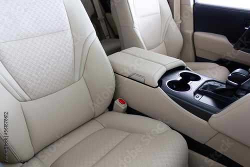 Luxury car inside. Comfortable leather seats. Cockpit in white perforated leather.