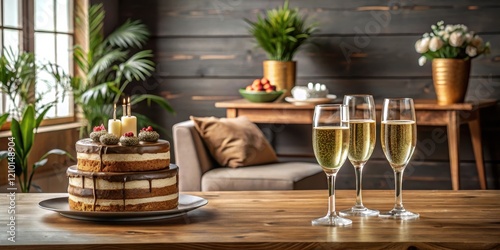 Luxury celebration with champagne and cake on a wooden table in a modern room, occasion, special, occasion, special