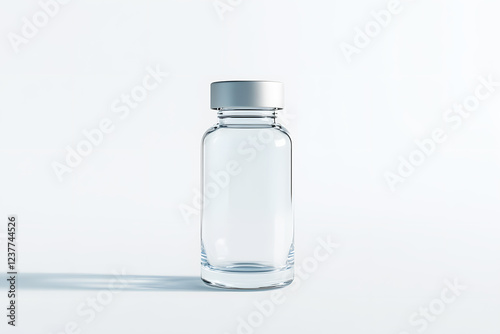 Luxury clear glass vaccine or medicine bottle with sleek and elegant design on white background with light and shadow. Shows bottle premium pharmaceutical concept. Medical Science Technology.