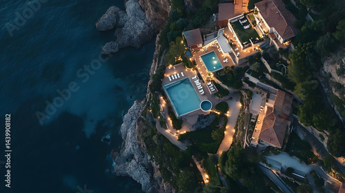 mediterranean sea, aerial view, night view, oceanfront, evening, resort, hotel, pool, vacation, travel