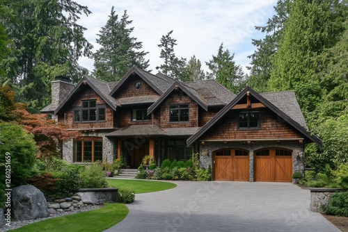 house, home, luxury, craftsman, architecture, real estate, wood, stone, tree, greenery, landscaping, driveway, window, exterior, residential, property, building, design, style, luxury home