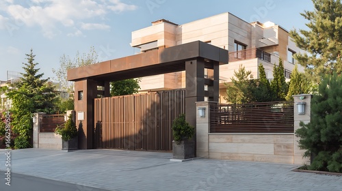 gate, house, entrance, driveway, exterior, building, modern, architecture, residential, property, luxury, home, real, estate, design, stone, facades, fence, private, nobody, tree, plant, evergreen, shrub, road, pavement, sky, cloud, day, sunlight, horizontal, apartment, residence, villa, suburb, lifestyle, wealth, investment, security