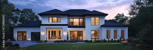 house, home, exterior, architecture, residential, building, design, property, modern, luxury, upscale, elegant, contemporary, facades, lawn, garden, landscaping, twilight, evening, sky, cloud, window, door, light, tree, grass, yard, plant, flower, balcony, patio, driveway, garage, style, estate, lifestyle, outdoors, peaceful, serene, tranquil, family, neighbourhood, suburb