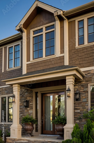 Luxury Home Exterior: Modern Stone and Wood Design. Stunning architecture, elegant facade, and landscaping. Perfect for real estate listings and home design inspiration.