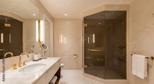 Luxury Marble Bathroom Interior with Glass Shower, Gold Fixtures, and Elegant Vanity Design