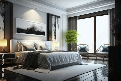 modern, bedchamber, interior, design, furniture, comfortable, bed, white, architecture, floor, wall, window, lamp, decoration, contemporary, style, empty, comfort, roomy, illustration, nobody, three-dimensional, render, table, light, concept, residence, cushion, living, blanket, new, sleep, headboard, lifestyle, carpet, wood, hotel, pillow, decor, estate, apartment, home, room, house, beautiful, classic, idea, background, shelf