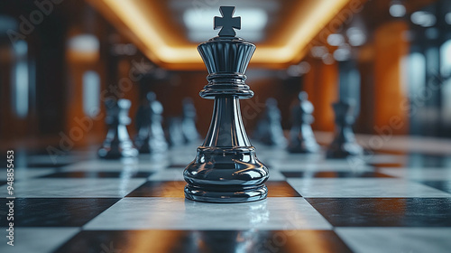 luxury metal chess piece on a blurred chessboard, symbolizing strategy, power, and competition. The elegant design and lighting highlight the intricacies of the game and decision-making