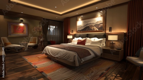 Luxury modern and contemporary hotel room interior, Cozy modern bedroom suite, Big double bed