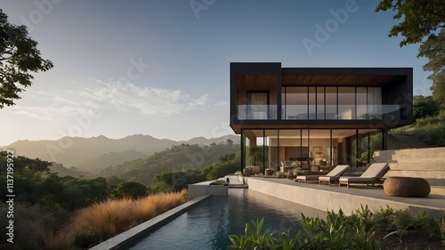 Luxury modern house and black steel elements,hotel-style interiors blending Indian and Indonesian aesthetics. Set in varied natural landscapes. (AI-generated)