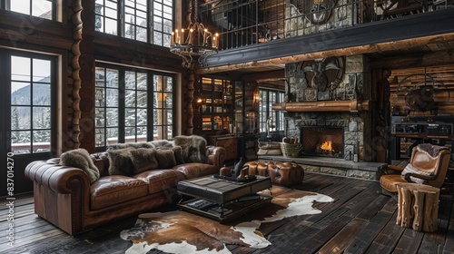 luxury, rustic, cabin, living, room, with, leather, sofa, stone, fireplace, mountain, forest, fabric, retreat, colours, texture, winter, set, ceiling, scenic, cosy, detail, furniture, wool, charme, layout, surround, modern, space, feature, furnish, design, placement, vibe, bungalow, to rest, floor, structure, fixture, wooden