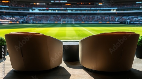 stadium, football, soccer, match, game, chair, lounge, view, panoramic, luxury, comfort, relaxation, sport, spectator, field, grass, seat, arena, event, competition, leisure, premium, vip, exclusive, modern, elegant, interior, design, architecture, perspective, background, daytime, bright, sunlight, beige, brown, table, plant, pot, goggles, sunglasses, object, sun, technology, eyewear, style, optical, computer
