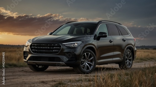 suv, luxury, black, sunset, dirt road, landscape, open, grass, vehicle, outdoors, nature, evening, drive, modern, transportation, adventure, horizon, travel, exploration, stylish, design, scenery, wheel, performance, leisure, journey, rural, shadow, sun, dusk, terrain, elegant, automotive, scenic, comfort, new, premium