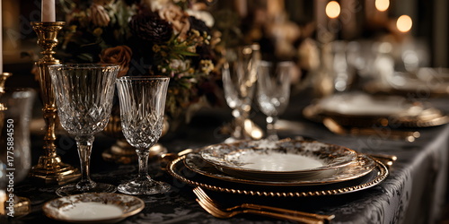 luxury, thanksgiving, tablescape, dinner, gold, crystal, wine glass, elegant, celebration, sophisticated, dark, moody, style, posh, black, silver, cutlery, napkin, lighting, ambience, feast, fine, dining, glamour, interior, modern, rich, design, centrepiece, hospitality, chic, holiday, epicure, event, banquet, minimal, opulent, decor, refinement, beauty, stylish