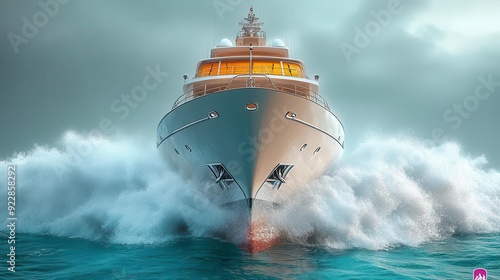Luxury yacht cutting through turbulent waves front view