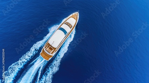 Luxury yacht sailing on deep blue ocean water, creating waves.