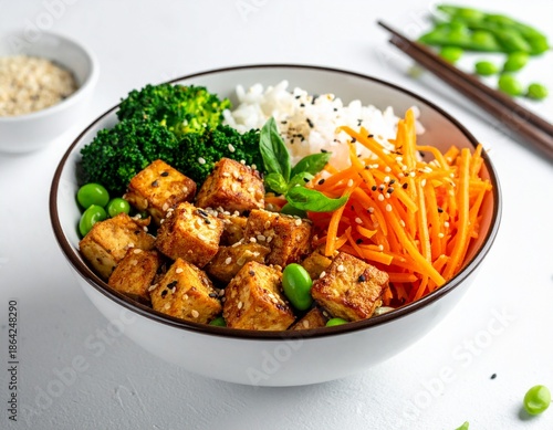 tofu, vegetarian, asian, epicure, broccoli, carrot, sesame, vegetable, close-up view, dish, generous, modern, top, decorative, leaky, healthy, presentation, aesthetic, dinner, dinner, clean, artistic, art, enjoyment, elegant, minimalist