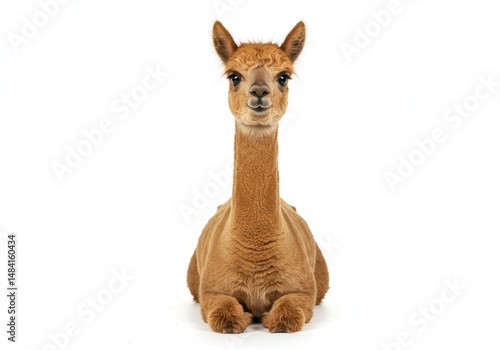 Lying alpaca with brown fur isolated on white background looking at the camera