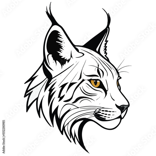 lynx, felino, animal, mammal, head, drawing, vignetting, illustration, portrait, wildlife, wild, predator, carnivore, black, white, eye, orange, detailed, artwork, art, design, whisker, ear, tuft, fur, outline, vector, graphic, face, profile, side, view, focused, expression, nature, zoo, cat, bobcat, beauty, wilderness, fauna, hunter, creature, mascot, fierce, elegance