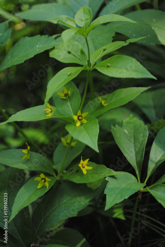 Lysimachia quadrifolia flowering with red and yellow blossoms in spring. Common names are whorled loosestrife, whorled yellow loosestrife, and crosswort.
