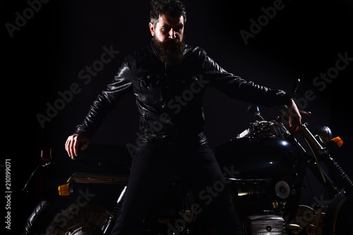 Macho, brutal biker in leather jacket stand near motorcycle at night time, copy space. Man with beard, biker in leather jacket lean on motor bike in darkness, black background. Biker culture concept.