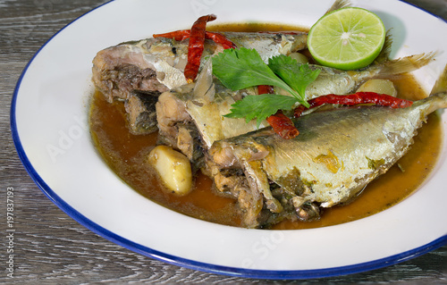 Mackerels in sweet and sour soup with spicy Thai food in white dish