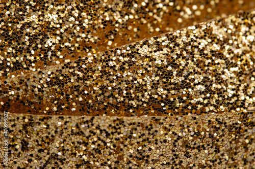 Macro abstract texture background of sparkling gold color Christmas holiday glitter ribbon with bokeh and copy space