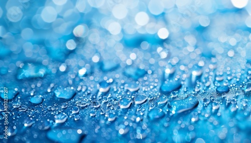 Macro Close-Up of Glistening Water Droplets on Blue Surface with Bokeh Effect, Copy Space