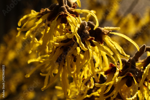 Macro close-up photograph of blooming witch hazel (Hamamelis) with vivid yellow ribbon-like petals and brown center. Unique winter and early spring flowering shrub, known for its medicinal properties