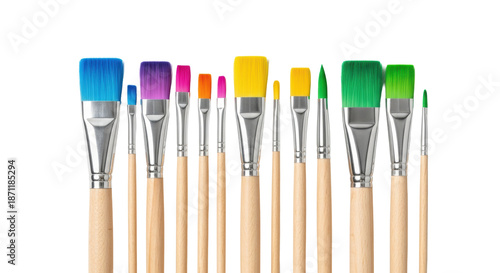 Macro, flat lay of fifteen new artist paintbrushes (blue, magenta, yellow bristles, birch handles) precisely aligned on transparent background, concept of professional studio product photography