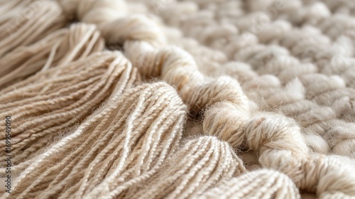 Macro image of natural-colored wool fringe with twisted yarn, forming the edge of a handwoven textile. Perfect for product detail, textile design, or craft visuals.