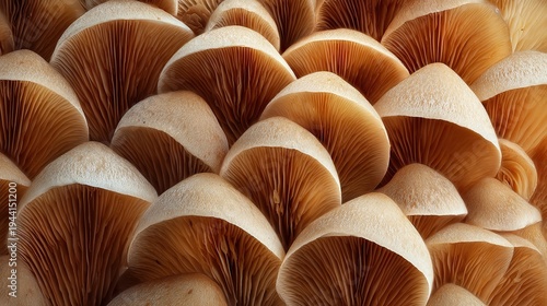 Macro pattern of densely packed mushroom caps forming organic texture background