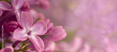 Macro photo of spring lilac purple flowers, abstract soft floral background.Beautiful purple floral banner