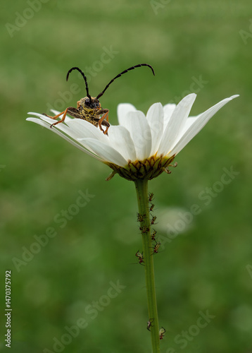 Macro photography in nature.A beetle with long whiskers on a daisy with white petals.