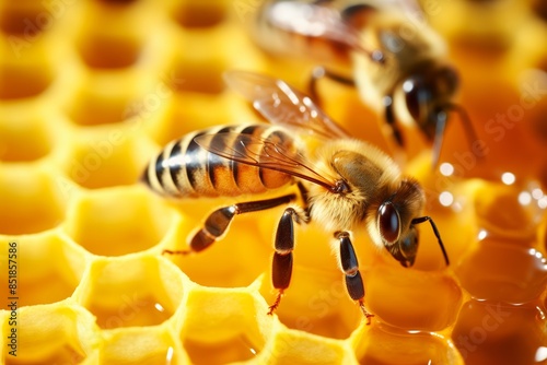 Macro shot of a honeybee with detailed wings and body, perched on a honeycomb dripping with honey