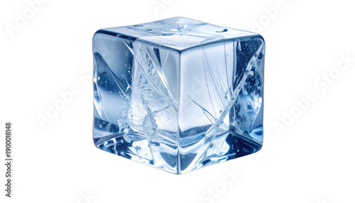 Macro shot of a single, fractured ice cube illuminated against a pure black background.