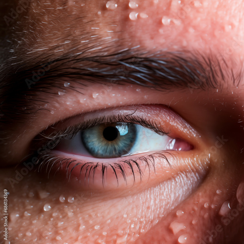 Macro shot of blue-green eye with water drops, sharp detail, shallow field of view.