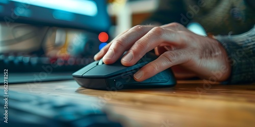 Macro shot of hand using computer mouse on cluttered desk. Concept Technology, Macro Photography, Workspace, Productivity, Office Essentials