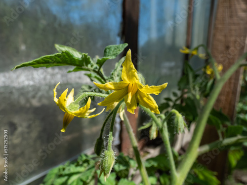 Macro shot of yellow flowers in full bloom of tomato plant growing on tomato plant before beginning to bear fruit in greenhouse. Vegetable seedlings, germinating