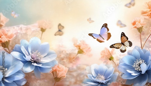 Macro shots, Beautiful nature scene. summer spring field in background blue sky with sunlight and flying butterfly, nature view.