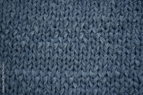 macro texture of blue knitted fabric with detailed pattern. Close-up of soft textile showing woven structure and calm cool tones. Clean and modern background perfect for winter concepts, fashion, tech