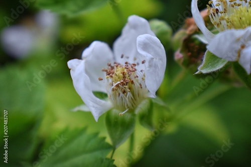 Macro view of Boysenberry (Rubus ursinus) blossom which is a cross among the European raspberry (Rubus idaeus), European blackberry (Rubus fruticosus), American dewberry (Rubus aboriginum), and loganb