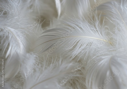Macro view of numerous fluffy, white down feathers suitable for hypoallergenic pillow or upholstery filling emphasizing comfort, cushion, delicate, bird
