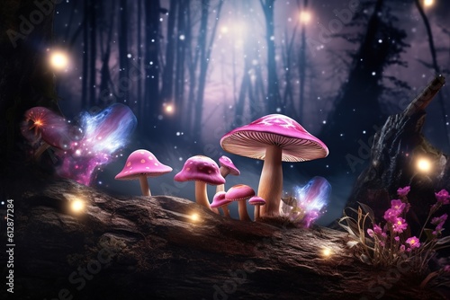 Magic mushrooms in the forest at night, Fantasy magic landscape.Generative Ai