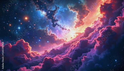Magical cosmic landscape featuring a radiant nebula and luminous star clusters