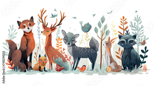 Magical Forest Creatures: Illustrations of Mystical Animals in a Forest Setting. Isolated Premium Vector. White Background