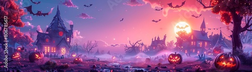 Magical Halloween Village with Jack-o'-Lanterns and Bats
