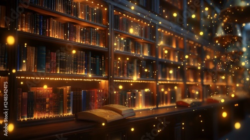 Magical library, glowing bookshelves, fairy lights, knowledge, education, fantasy background