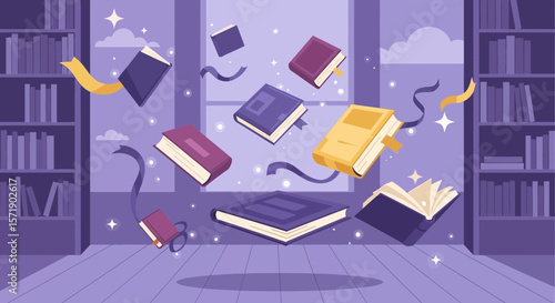 book, library, flying, magical, learning, imagination, room, education, study, fantasy, literature, cognition, reading, bookshelf, interior, vector, scene, abstract, graphic, cartoon, creative, design, illustration, collection, stack, culture, fiction, story, academic, open, closed, hardcover, ribbon, shelf, window, violet, purple, light, sparkle, dream, concept, school, bookshop, art