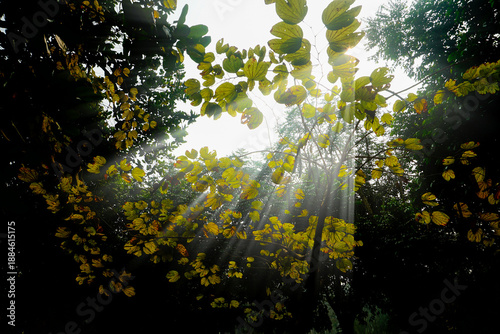 Magical sun rays coming down through foliage in winter morning, Howrah, West Bengal, India. Dark green leaves in the background creating useful contrast and copy space for advertising and other usage.