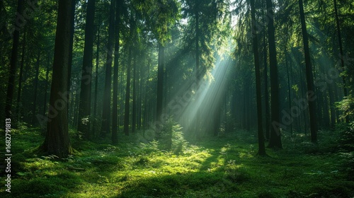 Magical sun rays penetrate through dense trees in a vibrant green forest